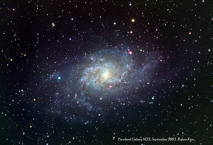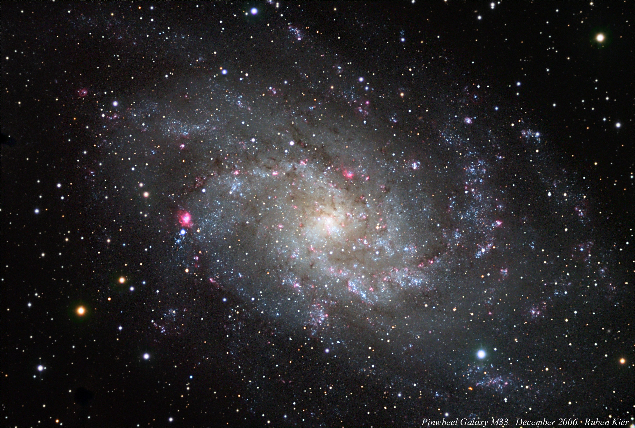 The Pinwheel Galaxy, M33, floats 2.3 million light years away, at the same distance as the Great Andromeda Galaxy. Its diameter of 50,000 light years is only a third of the