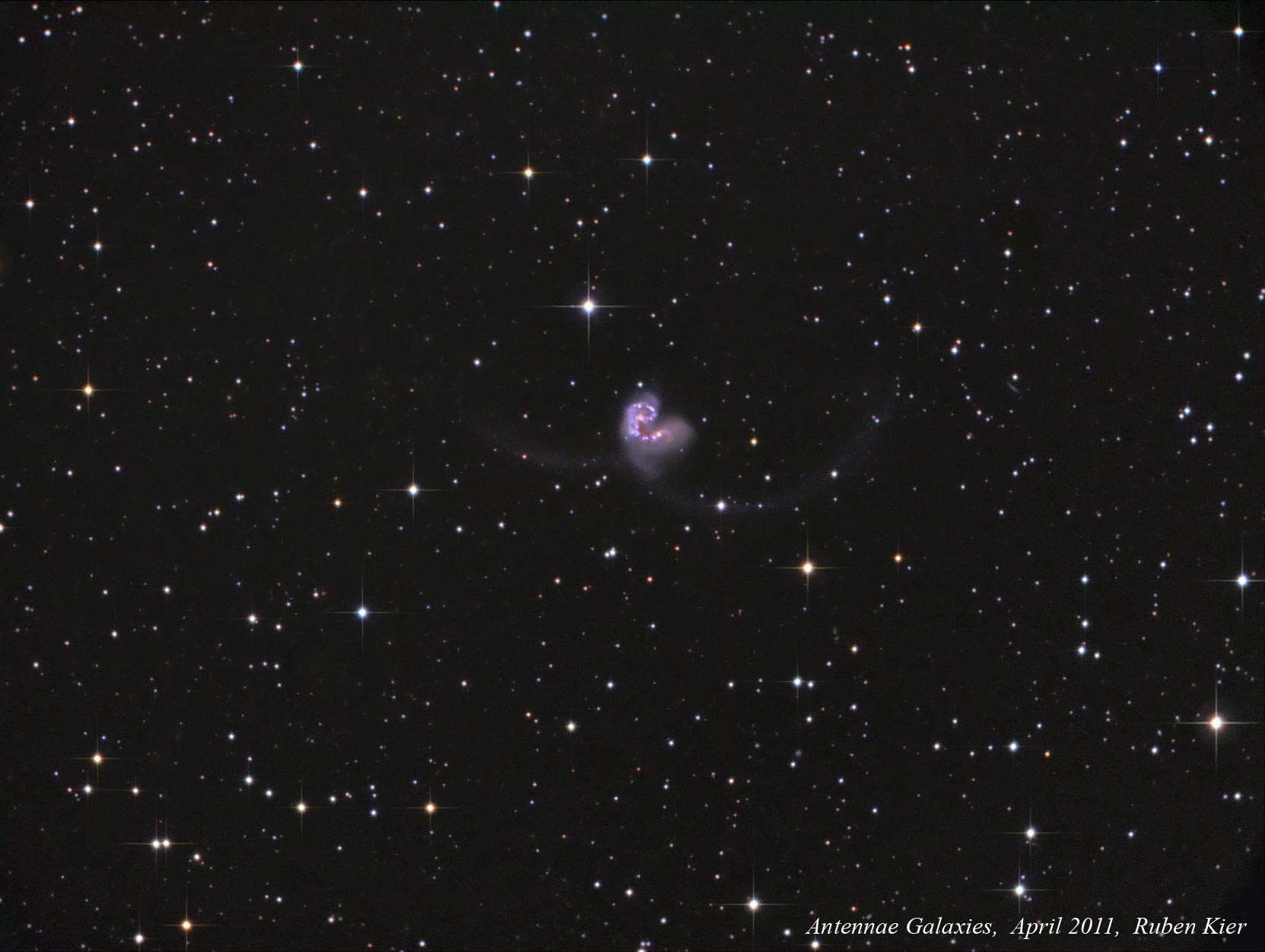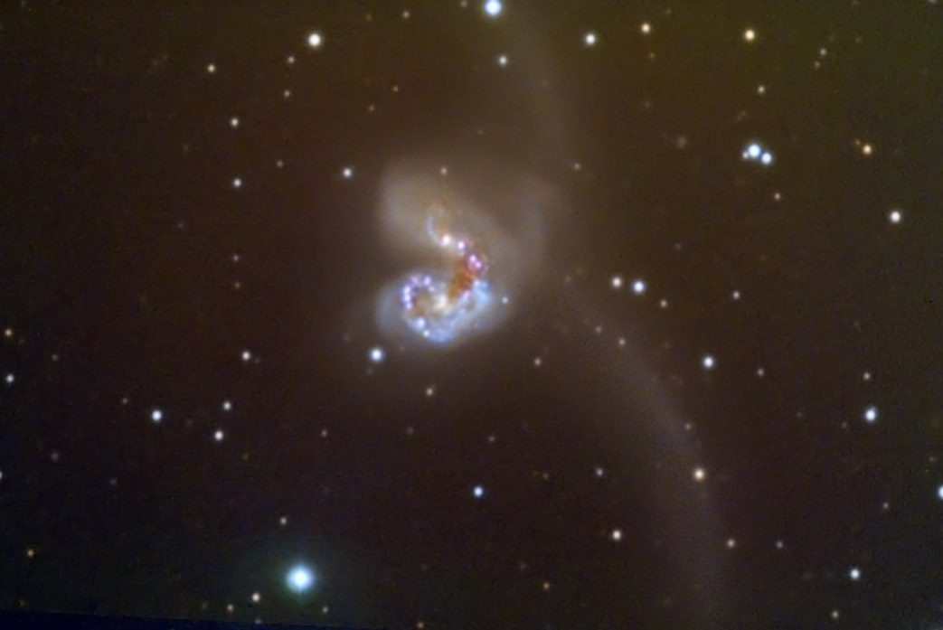The Antennae Galaxies represent a merging pair of galaxies at a distance of 50 to 60 million light years away in the constellation Corvus. A similar process may occur when our Milky Way galaxy combines with the Andromeda galaxy in a few billion years. The spiral galaxies NGC 4038 (lower in image) and NGC 4039 (upper) began to collide a few hundred million years ago. The focal blue star-like areas that are most prominent in the NGC 3038 actually represent young clusters each containing thousands of stars. The NASA website reports that about a hundred of the most massive clusters are believed to be young globular clusters. The brown dusty cores of the original galaxies merge in the center. The Antennae galaxies are named after their long "tidal tails" which developed during the first interaction of the galaxies between 200 to 300 million years ago.