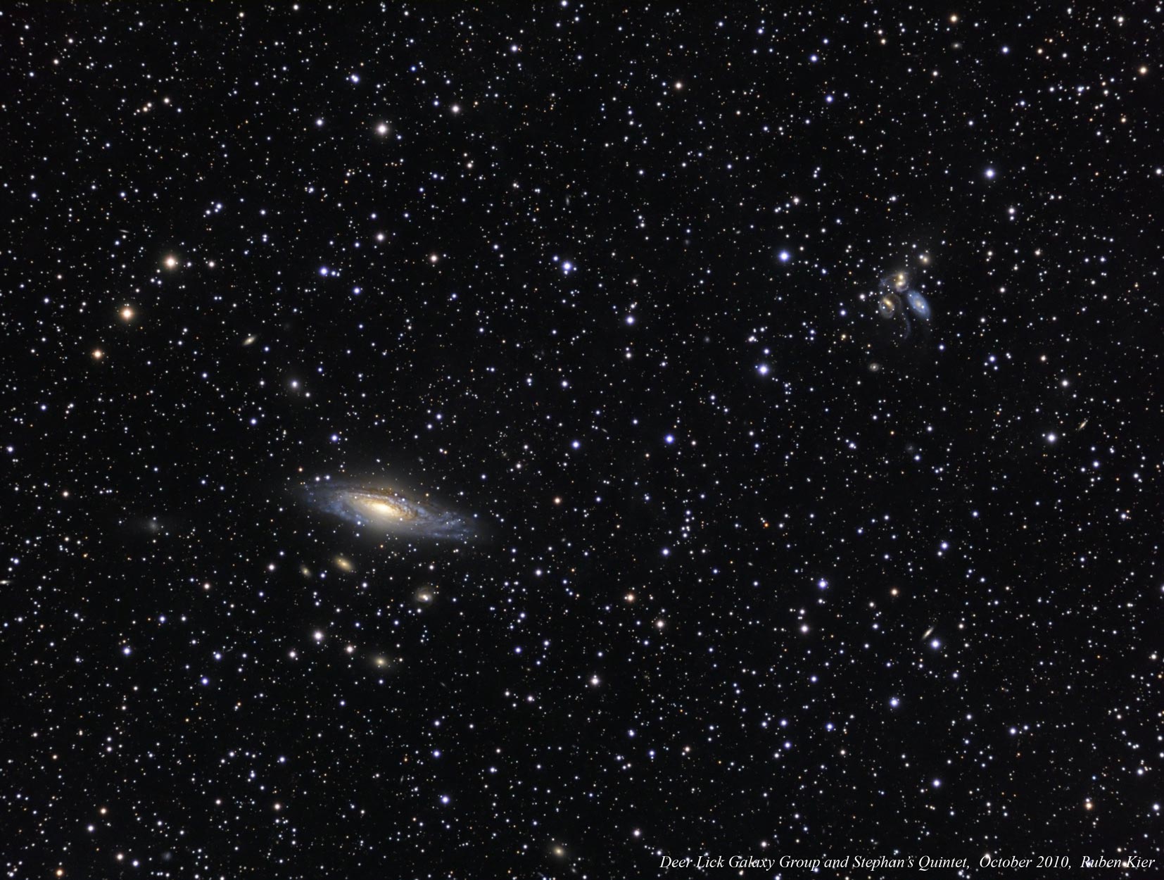 In my book, The 100 Best Astrophotography Targets, I suggested that the Deer Lick Galaxy Cluster (left) could be framed nicely with Stephan's Quintet (right). I have finally tried this composition, and found that it was quite easy. Each galaxy group is quite bright and easily resolved, even with a resolution of only 1.1 arcsec/pixel that I used for this image. Although I collected 6.5 hours of exposures, I could have obtained a nice image in half that time.