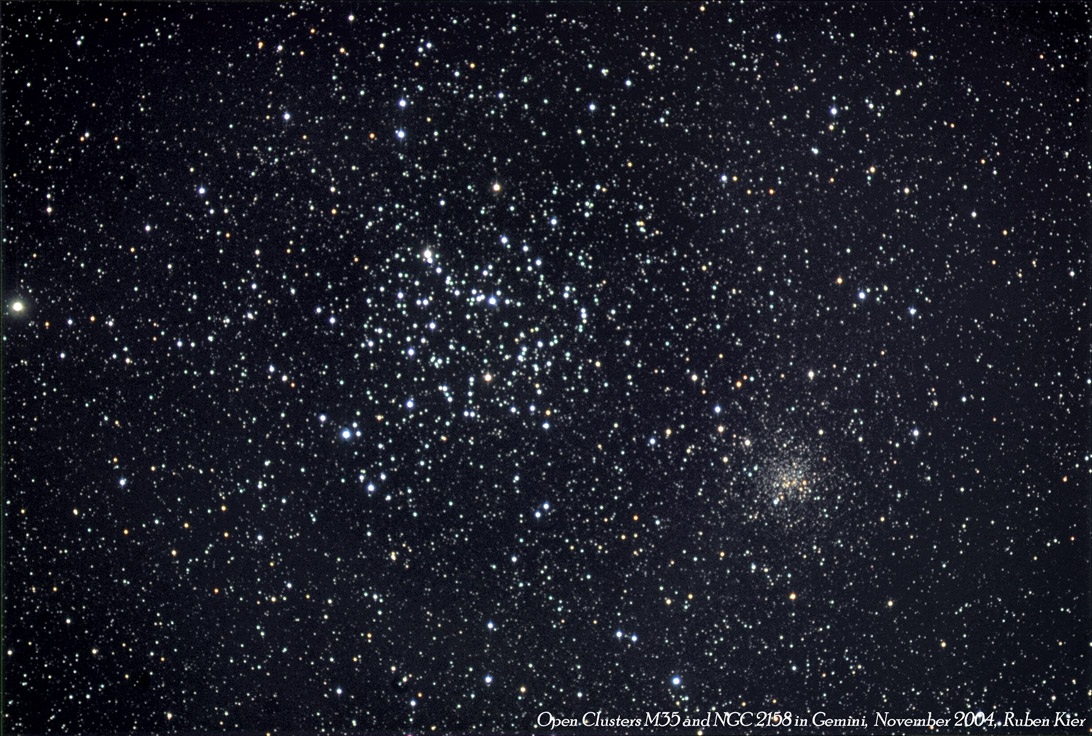 richer. The youthful M35 shines with bright energetic blue white suns, whereas the more mature NGC2158 is populated by more gently glowing