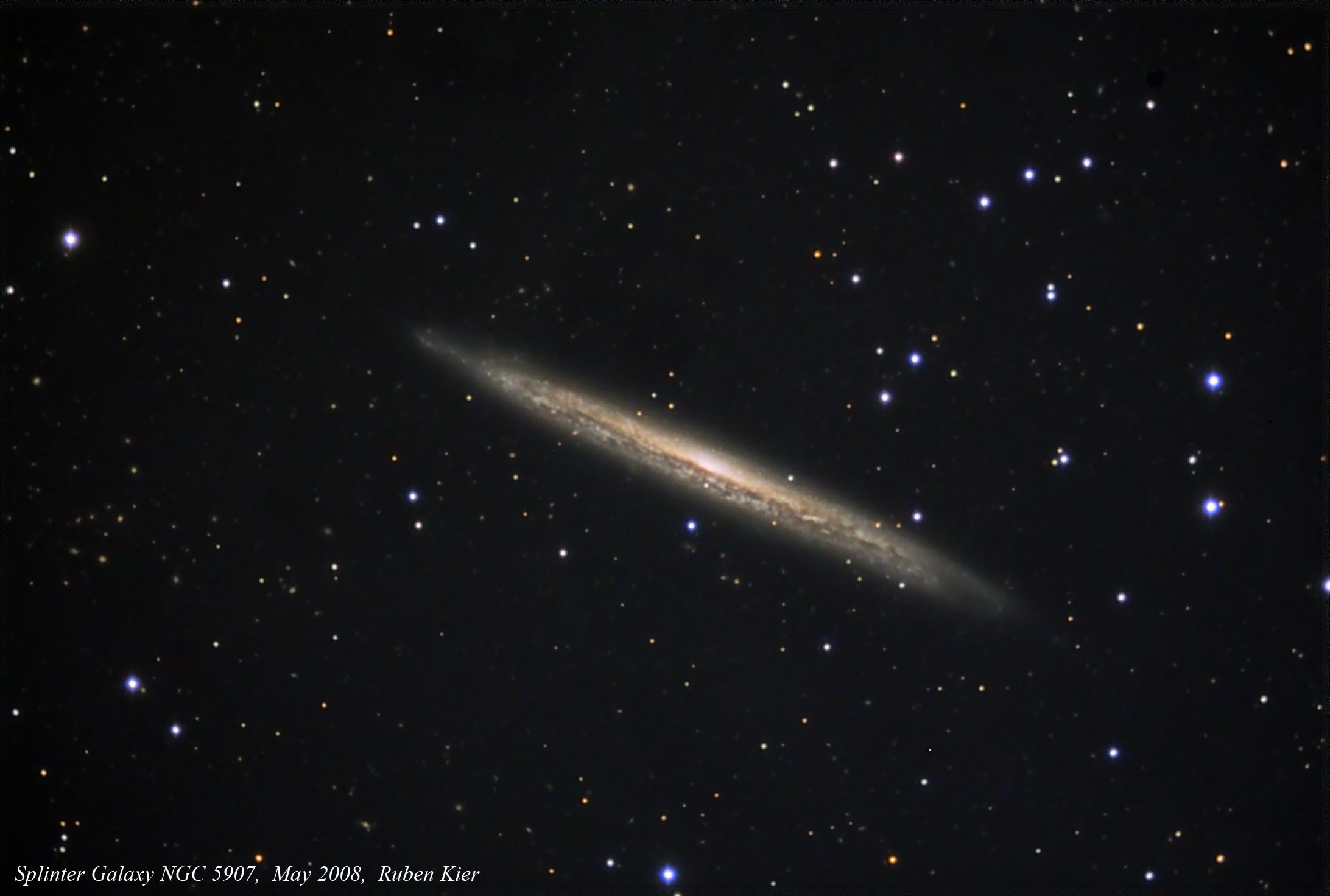 The Splinter Galaxy (NGC 5907) is an edge-on spiral galaxy in Draco. At a distance of 40 million light-years away, dust lanes partially